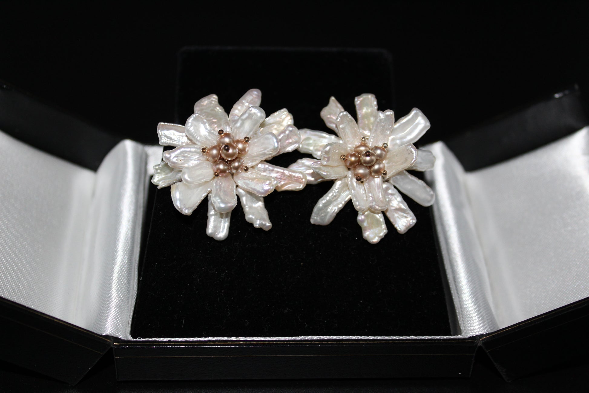 These sterling silver clip Keshi pearl fresh water earrings with fresh water pearl stamen. These earrings are 1 1/2" across. The small stamen pearls are 4mm. These earrings look like a beautiful flower when worn. Standard shipping is included.